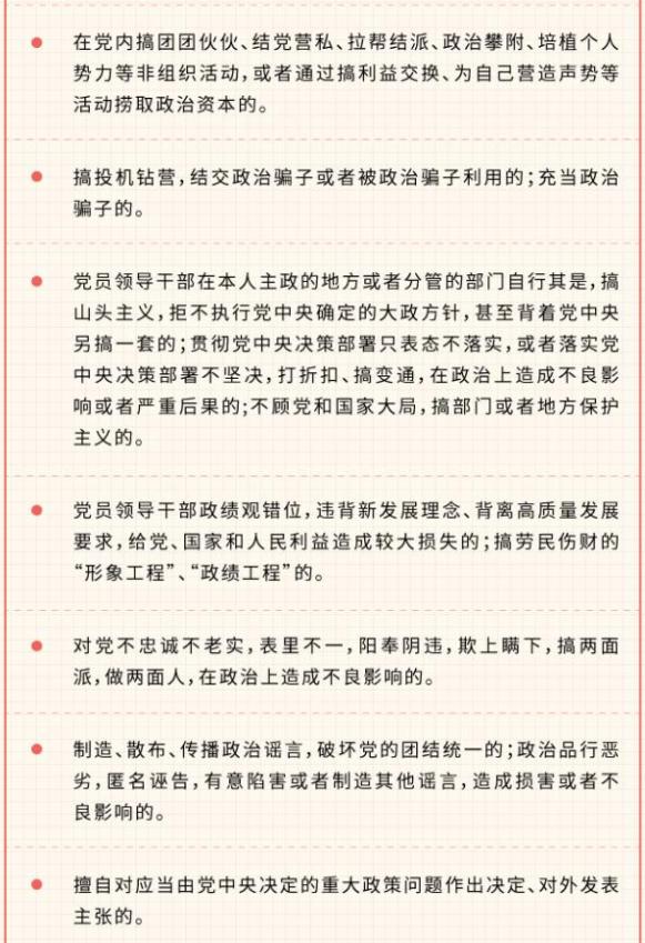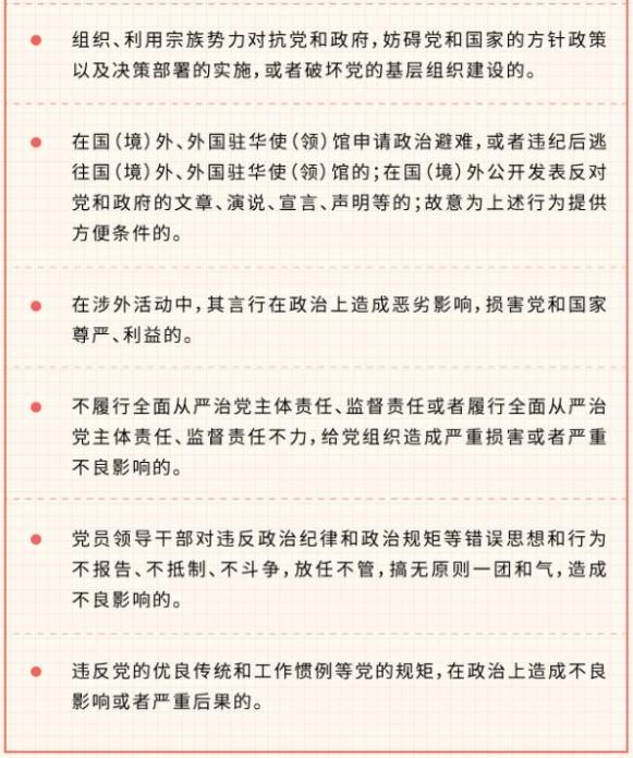 政治纪律是党的各级组织和全体党员在政治方向、政治立场、政治言论和政治行为方面必须遵守的行为准则,是维护党的团结统一的根本保证。政治纪律是最重要、最根本的纪律,是打头、管总的纪律,遵守党的政治纪律是遵守党的全部纪律的重要基础。《条例》第六章规定了对发表危害党的言论,破坏党的团结统一,损害中央权威、妨碍党和国家方针政策实施,对抗组织审查,组织和参加迷信活动,在涉外活动中损害党和国家尊严利益,违反政治规矩等行为的处分。