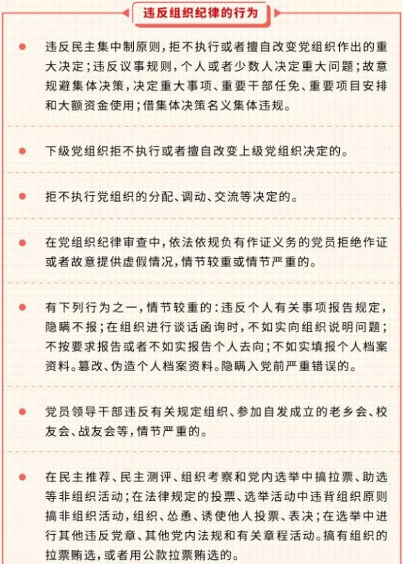 组织纪律组织纪律是规范和处理党的各级组织之间、党组织与党员之间以及党员与党员之间关系的行为规则,是维护党的集中统一、保持党的战斗力的重要保证。《条例》第七章规定了对违反民主集中制原则、侵犯党员权利、违反组织工作原则、违规办理因私出国(境)证件和在国(境)外擅自脱离组织等行为的处分。