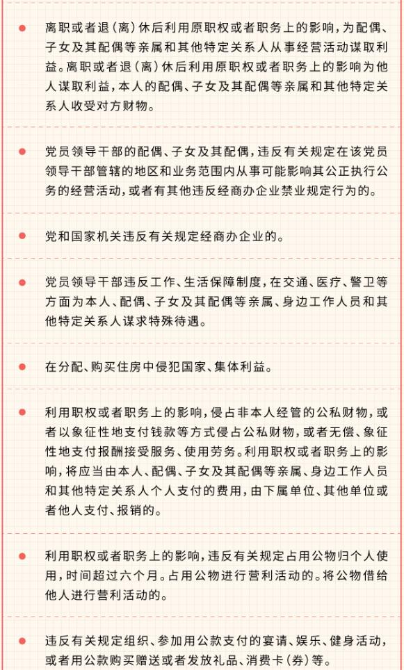 廉洁纪律廉洁纪律是党组织和党员在从事公务活动或者其他与行使职权有关的活动中,应当遵守的廉洁用权的行为规则,是实现干部清正、政府清廉、政治清明的重要保障。《条例》第八章规定了对以权谋私,违规接受礼品礼金和服务,违规从事营利活动,违反工作生活待遇规定,违规占有、使用公款公物,钱色、权色交易等行为的处分。