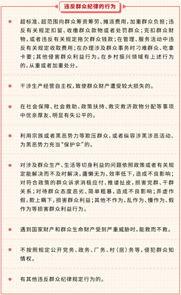 群众纪律群众纪律是党组织和党员在贯彻执行党的群众路线和处理党群关系过程中必须遵循的行为规则。群众纪律是党的性质和宗旨的体现,是密切党与群众血肉联系的重要保证,更具有执政党纪律的特色。《条例》第九章规定了对侵害群众利益、漠视群众利益、侵犯群众知情权等行为的处分。