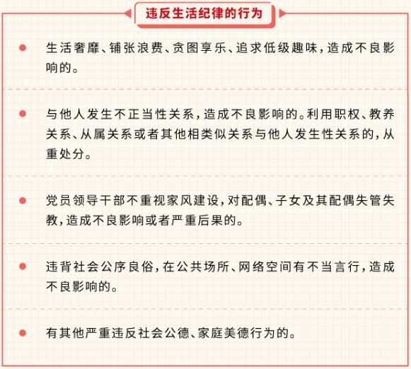 生活纪律生活纪律是党员在日常生活和社会交往中应当遵守的行为规则,涉及党员个人品德、家庭美德、社会公德等各个方面,关系党的形象。《条例》第十一章规定了对生活奢靡、违反社会公德和家庭美德等行为的处分。