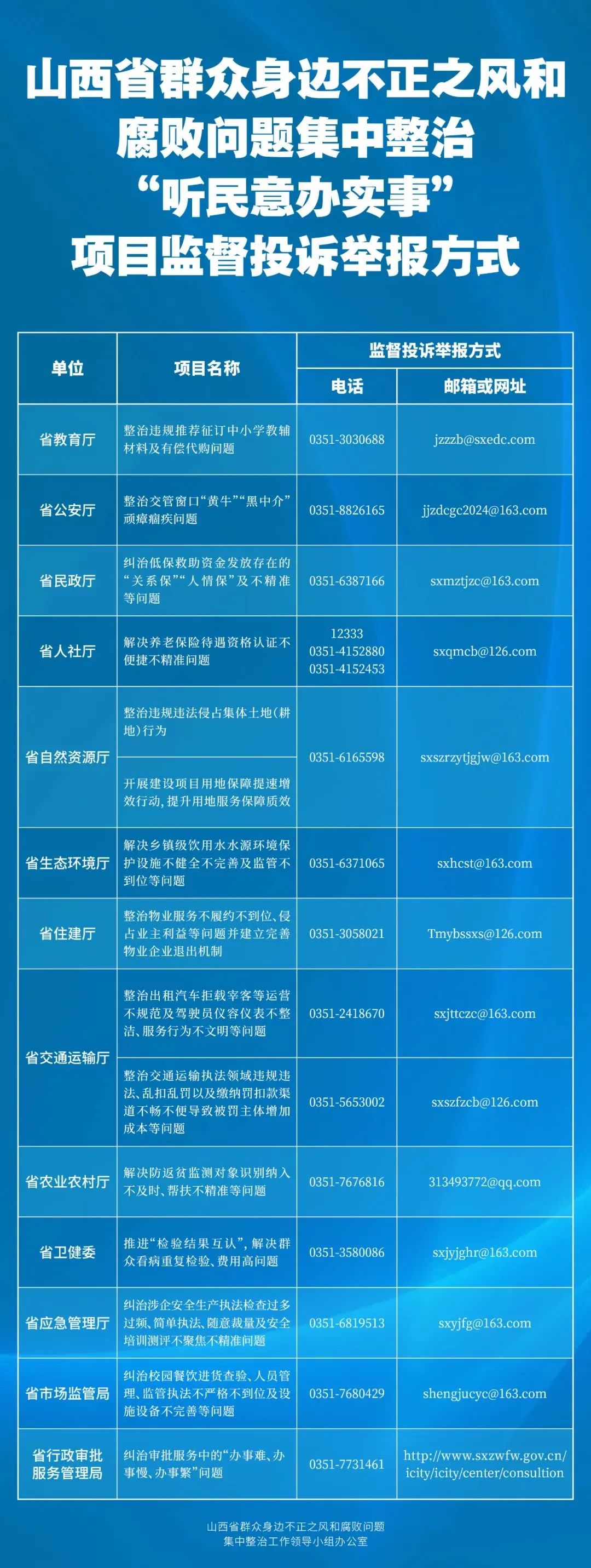 原标题:《山西省群众身边不正之风和腐败问题集中整治“听民意办实事”项目监督投诉举报方式》