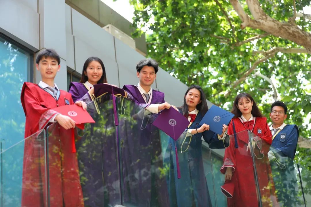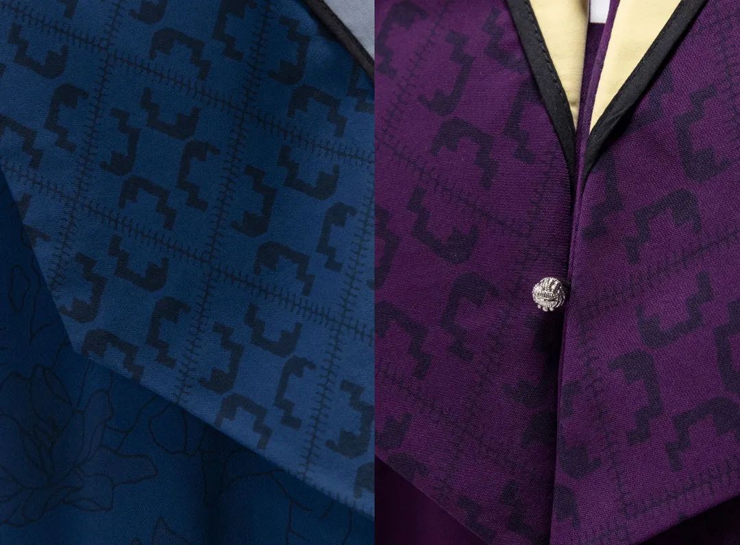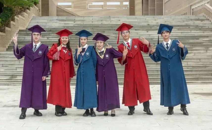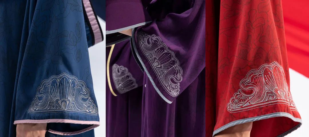 中国传统的色彩来自于天地万物,内藏着深厚的文化底蕴,设计师从中国传统色板中取色,根据身份与学位设置,学士、硕士、博士分别选用瑾瑜、油紫、顺圣作为袍身底色。