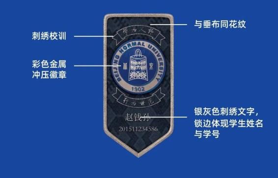 色彩与学位服保持一致,一针一线绣上校徽、校训及每一位毕业生的姓名、学号,象征着每一位师大学子都是北师大独一无二的存在。
