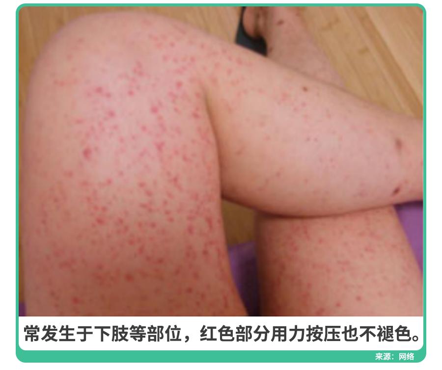 除了影视剧经常表现的流鼻血之外,实际上表现为瘀点和紫癜的皮下出血更为常见,常发生于下肢等部位。红色部分用力按压也不褪色,是和过敏性皮疹,病毒疹等充血性皮疹的鉴别要点。
