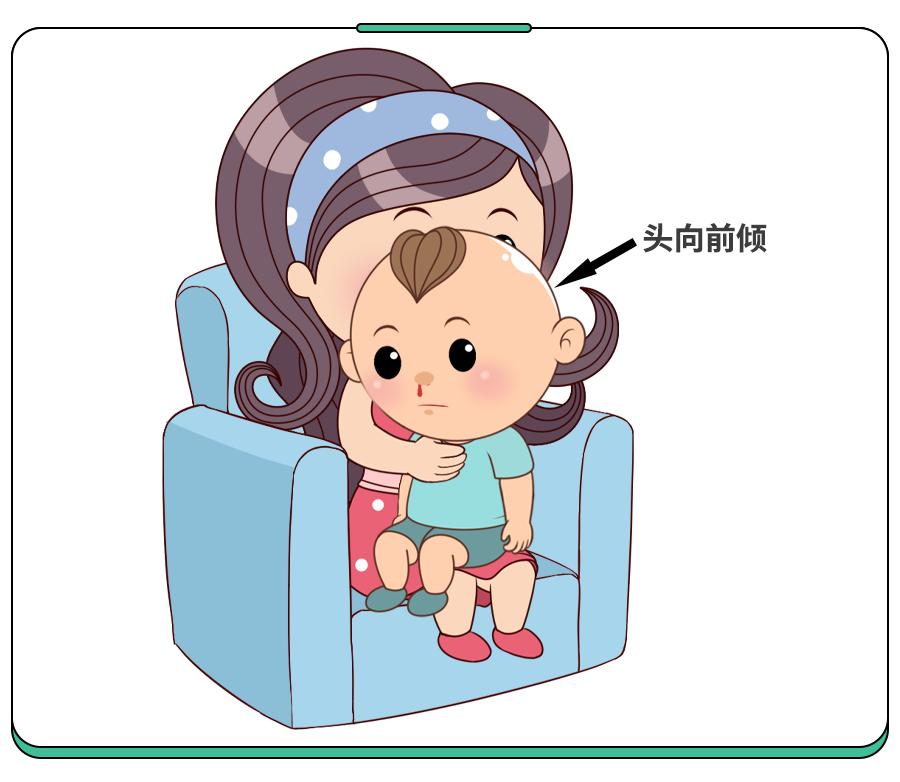 让娃低下头,小宝宝可以坐在大人的腿上,头部向前倾斜。