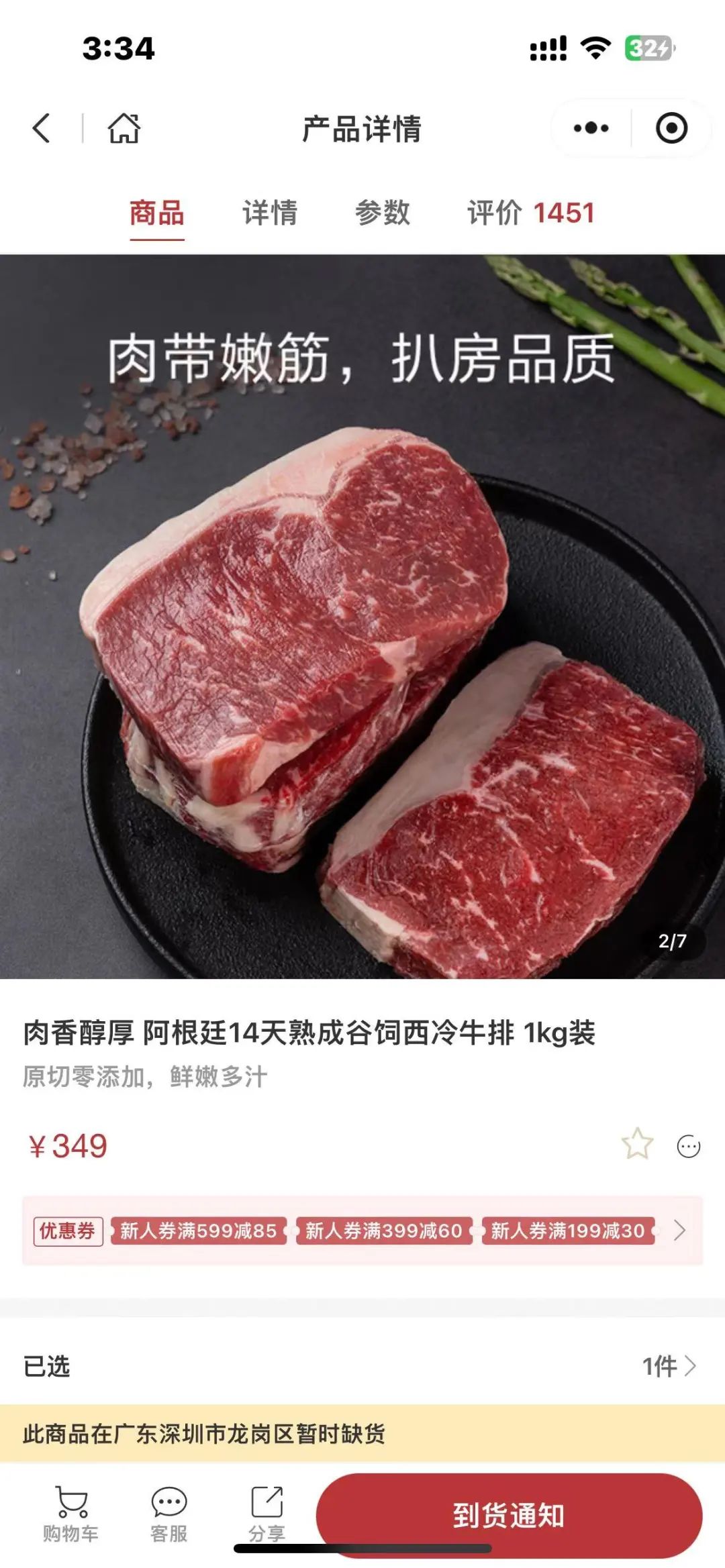 蓝鲸新闻记者查询发现,该平台目前共有7款牛肉产品在售,均为阿根廷进口、顺丰冷链配送,基本上每千克单价在160元以上,价格最高的谷饲肉眼牛排的单价高达349元/kg,均远高于其他电商平台同类产品。