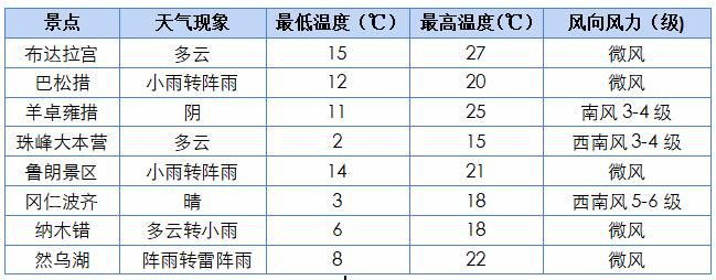 明日白天:林芝、昌都南部和山南南部阴天有小雨,部分地方有中雨;拉萨北部、昌都北部、那曲东部、日喀则南部和山南东部多云间阴天,部分地方有阵雨或雷阵雨;其他地方少云间多云。