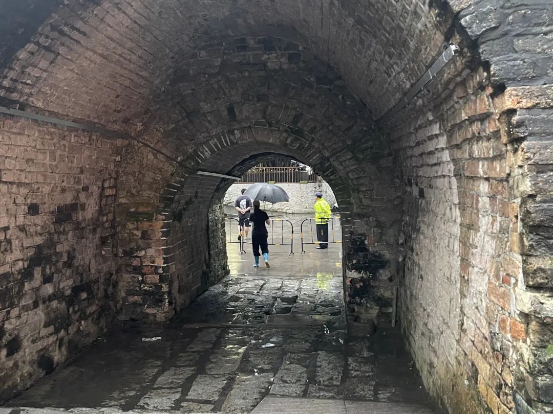 记者走访发现,由于风大雨急,大鹏所城内的游客稀少,另外三个城门外均搭起了防护栏,限制游客入内,距离南门最近的商户李先生告诉记者,南门城墙东侧凸角部分是从中间坍塌,由于事发时雨势太大,并未产生大的声响,他表示,如果不是工作人员及时赶到通知,离得稍远一些的商户根本不知道发生了坍塌事件。