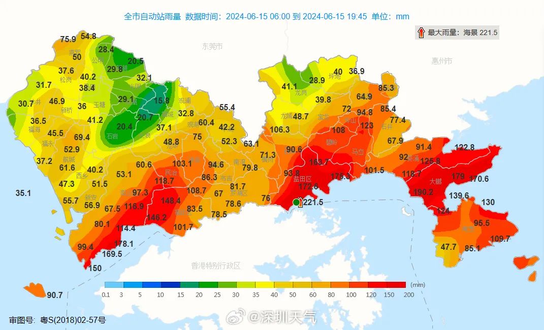 记者从深圳市气象台了解到,15日早晨至傍晚,深圳市先后受三轮强雷雨影响,普遍记录到大暴雨。三轮强降雨落区集中,大暴雨主要在南山、福田、盐田、坪山、龙岗和大鹏,具有持续时间长、累积雨量大、伴有强雷雨大风的特点。6月15日6时至19时45分,深圳平均雨量80.1毫米,各区平均雨量:盐田(162.1毫米)、大鹏(118.1毫米)、南山(106.1毫米)、福田(95.9毫米)、坪山(92.9毫米)、罗湖(71.4毫米)、龙岗(60.1毫米)、龙华(51.3毫米)、宝安(43.5毫米)、光明(32.9毫米);深圳最大累计雨量221.5毫米(盐田区海山街道),最大1小时雨量为 85.3 毫米(大鹏新区大鹏办事处),最大阵风26.4米/秒(10级,南山区南山街道妈湾站);深汕平均雨量109.4毫米,最大累计雨量178毫米(小漠镇华润电厂站),最大1小时雨量90.1毫米(小漠镇华润电厂站),最大阵风19.1米/秒(8级,鲘门镇芒屿岛站)。