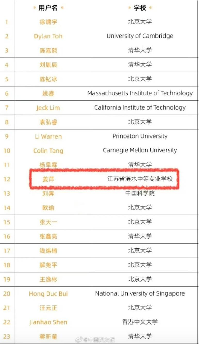 从江苏省涟水中等专业学校参赛的姜萍,堪称近年来数学竞赛届的黑马,点燃了教育界的星星之火。也让无数学子萌发出斗魂。