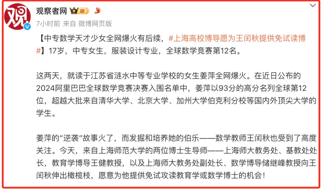 一夜之间,姜萍成了中国互联网当下最火女孩。17岁,中专在读,服装设计专业,冲进2024阿里巴巴全球数学竞赛12强。