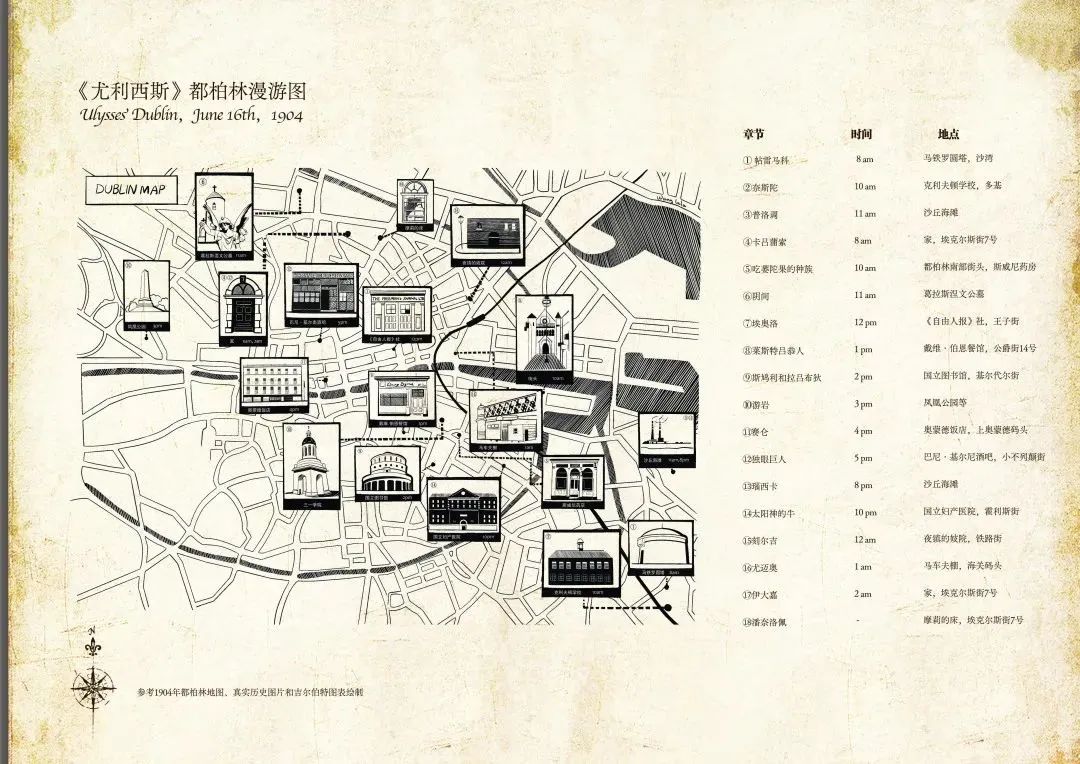 译林珍藏纪念版《尤利西斯》特别附赠了复古手绘都柏林漫游图。这张地图根据1904年的都柏林地图和真实的历史图片绘制而成,每一个地标上都注有地标在小说中出现的章节以及时间,方便你在阅读过程中随时查看布卢姆sir的行动轨迹。