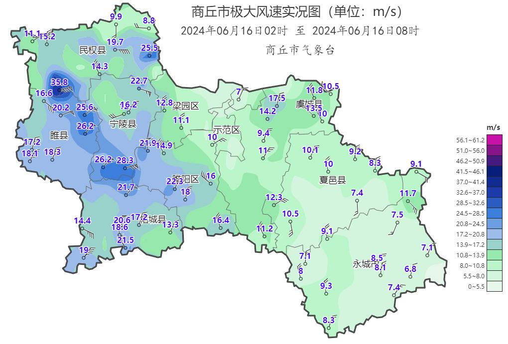 6月16日02时至08时,我市出现大风天气,阵风7~8级,部分地区9~10级,局地12级,最大风速出现在民权龙塘35.8m/s(12级)。