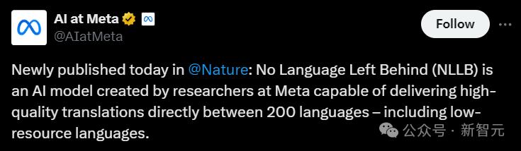 Meta AI刚刚在社交媒体X上宣传自家的大模型NLLB,全称为No Language Left Behind,这个AI模型能够翻译200种语言,包括资源匮乏的语言。