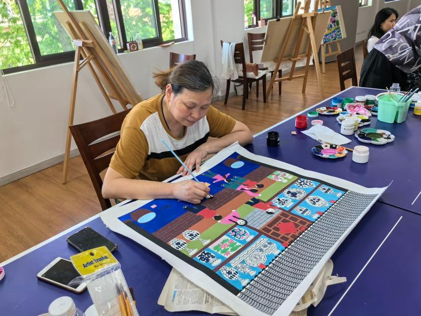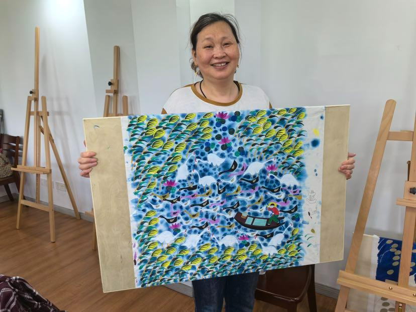 “学员们都很认真、很聪明,构思也很有新意。”两个月的授课,让王金喜看到了学员们对农民画的热爱,也发现了学员们心中的“真善美”。林翠玉是今年首次参加培训的学员,“我从小就喜欢画画,画画对身心都有好处。”在全身心投入绘画的过程中,翠玉感到心静了下来,一条埭、一条河、一座桥、一群孩童……一笔一画勾勒出的画面,就是她心中的家园。