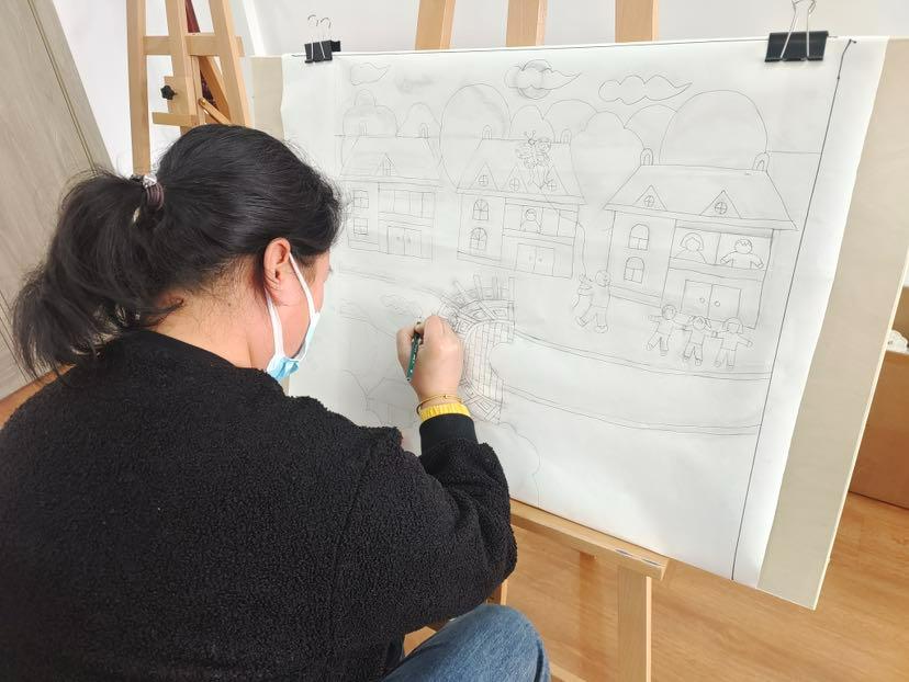 在农民画创作上,区残联选定了“新农村”“新时代”“新风尚”和“清正廉洁”四个主题,以此激发学员们对生活的感悟和思考。此次创作,张美红选择了“新农村”主题,“我想把心中美好的生活画在纸上。”还有的学员将田园生活、金山美丽乡村和记忆中小时候的农村生活这三个元素结合起来,融入到农民画中,画出了“向往的生活”。