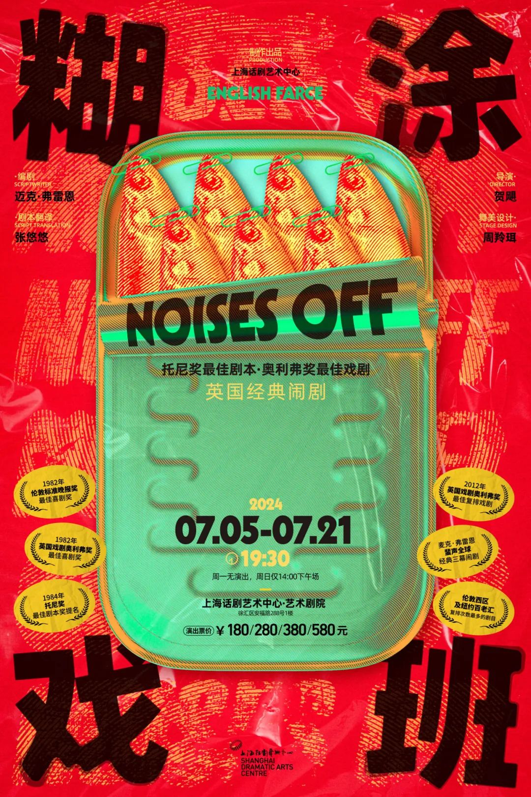 制作出品:上海话剧艺术中心 | 出品人:张惠庆 | 总监制:田水 | 艺术总监:喻荣军 | 联合监制:何念 | 制作人:刘立 | 编剧:迈克·弗雷恩 Michael Frayn[英] | 剧本翻译:张悠悠 | 导演:贺飓 | 舞美设计:周羚珥 | 制作经理:金广林 | 作曲:吴骏浩 | 灯光设计:陈依丛 | 服化设计:徐丛婷 | 道具设计:郁树西、刘毅、邵振东 | 音效设计:丁毅、钱杰 | 技术设计:徐先根 | 舞台监督:朱星宇 | 助理制作人:梁歆佚