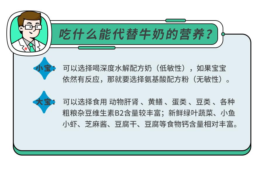 如果吃完奶制品,不只出现呕吐、腹痛、腹泻等胃肠道不适情况,还出现了湿疹、急性荨麻疹、喉头水肿,甚至过敏性休克,那就该考虑是不是牛奶蛋白过敏的问题了。◆牛奶蛋白过敏:避免过敏,最好的办法就是避免摄入牛奶及奶制品。
