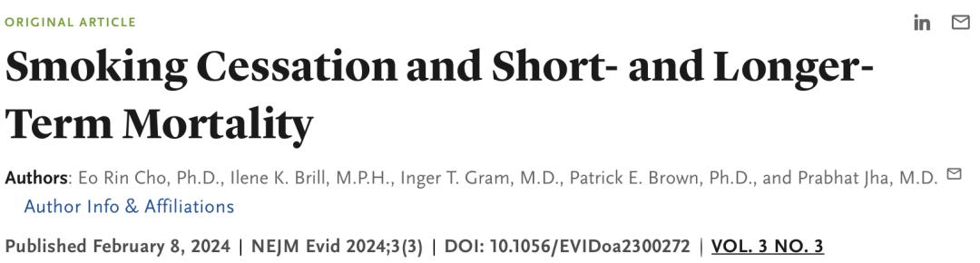 [1]Cho ER, Brill IK, Gram IT, Brown PE, Jha P. Smoking Cessation and Short- and Longer-Term Mortality. NEJM Evid. 2024 Mar;3(3):EVIDoa2300272. doi: 10.1056/EVIDoa2300272. Epub 2024 Feb 8. PMID: 38329816.