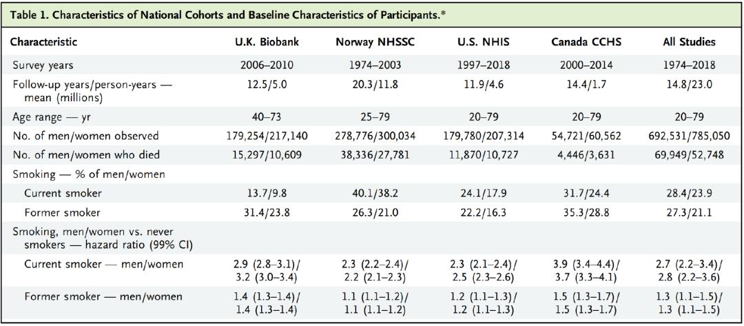 DOI: 10.1056/EVIDoa2300272为了得到广泛适用的结果,研究者统计了1974年至2018年期间来自美国、英国、挪威和加拿大四国的148万成年人吸烟情况,年龄覆盖20至79岁。最终,在14.8年的随访期间记录到122,697个死亡案例。