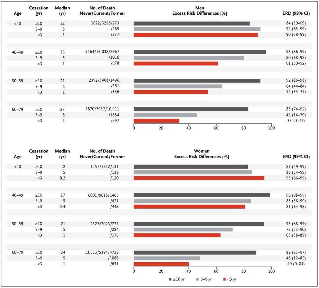 结果显示,40岁及以下短期戒烟,参与者的死亡率接近于从不吸烟者,女性和男性的超额死亡风险分别降低95%和90%。而在50-59岁期间戒烟,女性和男性的超额死亡风险分别降低63%和54%;而到了60-79岁再戒烟,超额死亡风险则降低了40%和33%。