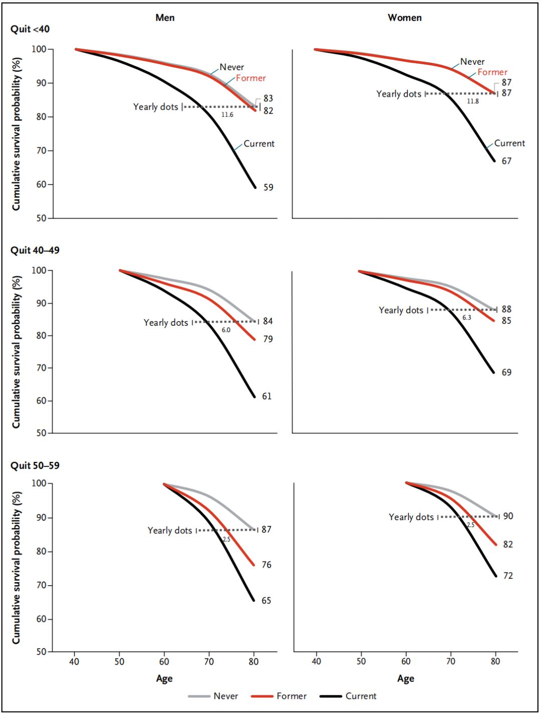 与先前的研究结果一致,越早戒烟的效果越好。40岁之前戒烟的存活率最高,可使80岁前的存活率提高12岁;其次是40-49岁左右戒烟,大约提升6岁;在50-59岁戒烟的话,存活率仅能提高2.5岁。