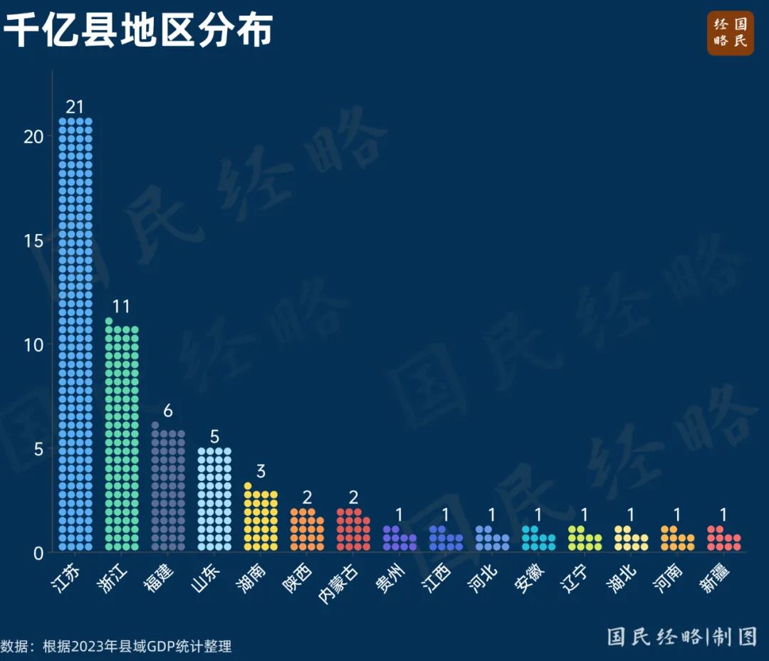 具体来看,江苏多达21县入围,浙江11席,福建6席,山东5席。可以说,全国最富的省份,正在批量制造“千亿县”。