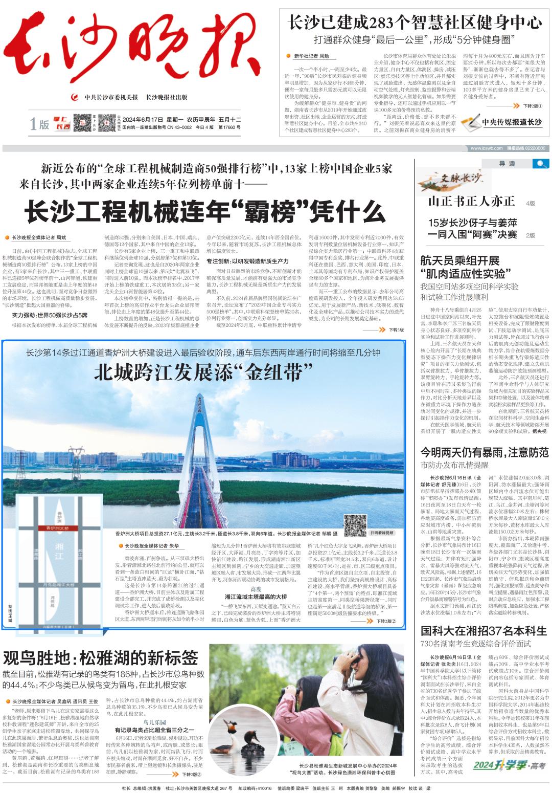 6月17日,长沙晚报头版以《北城跨江发展添“金纽带”》为题,报道长沙第14条过江通道香炉洲大桥建设进入最后验收阶段。以下为报道原文: