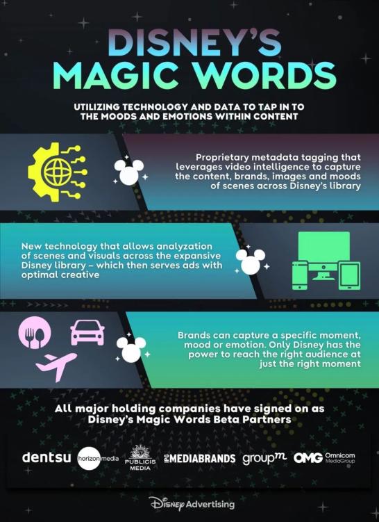 在国际市场上,迪士尼成为了在AI驱动广告方面走在最靠前的人,其“魔法词(magic word)”技术通过AI和机器学习,深入分析海量影视内容,精准识别场景中的情绪、内容和品牌。品牌方可以利用这些“魔法词”,定制与场景基调完美契合的广告,实现更有效的触达。