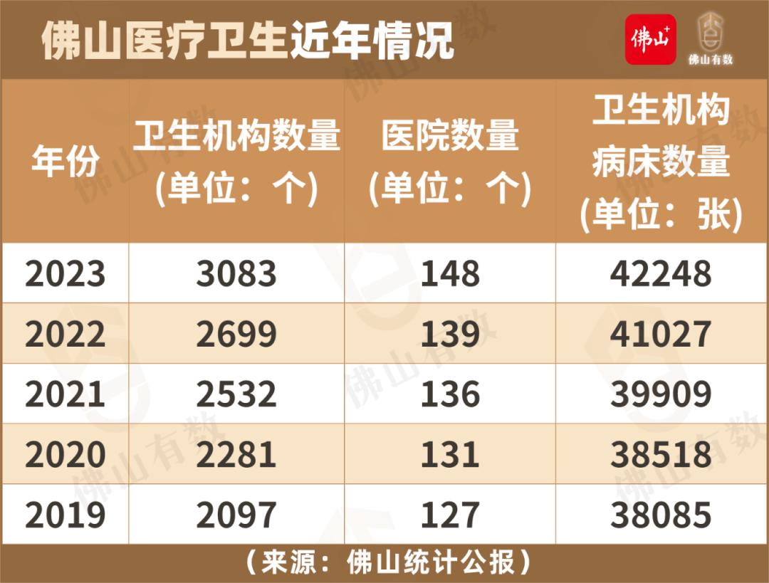 五年新增近千个卫生机构佛山统计公报显示,截至2023年末,佛山全市共有卫生机构3083个,其中医院148个,卫生机构实有病床42248张。按照常住人口统计,2023年每千人口病床床位4.39张。