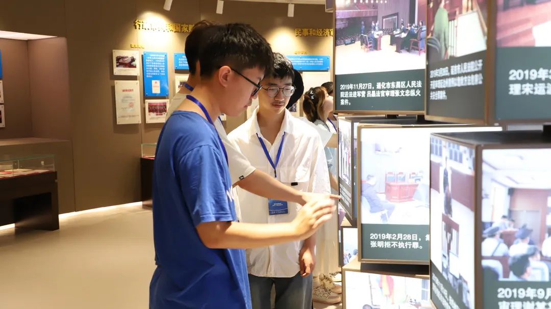 “请大家遵守法庭纪律、保持手机静音”,在引导员的提示和引领下,参观人员有序步入正在进行的执行异议之诉民事二审案件和民事再审劳动争议案件庭审现场,身临其境体验庭审威严。庭审结束后,法官还邀请参观人员走上审判席,并详细介绍了在线庭审、电子证据出示、笔录同步生成等功能。