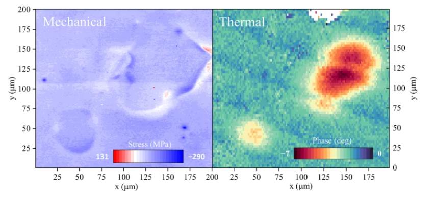 图5. 局部热-机械分布图:(a)拉曼图转换为应力,18 kHz FDTR图用于热部分。来源:DT-Carbontech
