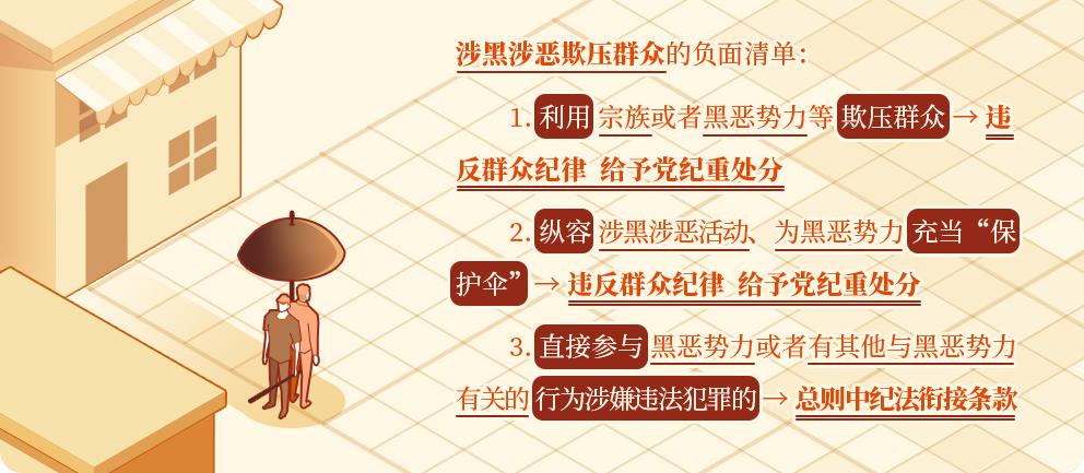 《中国共产党纪律处分条例》将利用宗族或者黑恶势力等欺压群众,或者纵容涉黑涉恶活动、为黑恶势力充当“保护伞”行为,规定为违反群众纪律的行为,给予撤销党内职务或者留党察看处分;情节严重的,给予开除党籍处分。如果党员直接参与黑恶势力或者有其他与黑恶势力有关的行为涉嫌违法犯罪的,应当适用总则中纪法衔接条款处理。