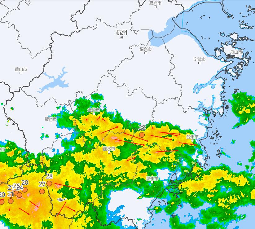 目前强降水回波位于我市仙居、黄岩以及温州北部一带,并逐渐向偏东方向移动,将继续影响我市中部、南部等地。受其影响,今天我市大部地区有中到大雨,中部、西部地区局部有暴雨,最大小时雨强20~40毫米,请注意防范。