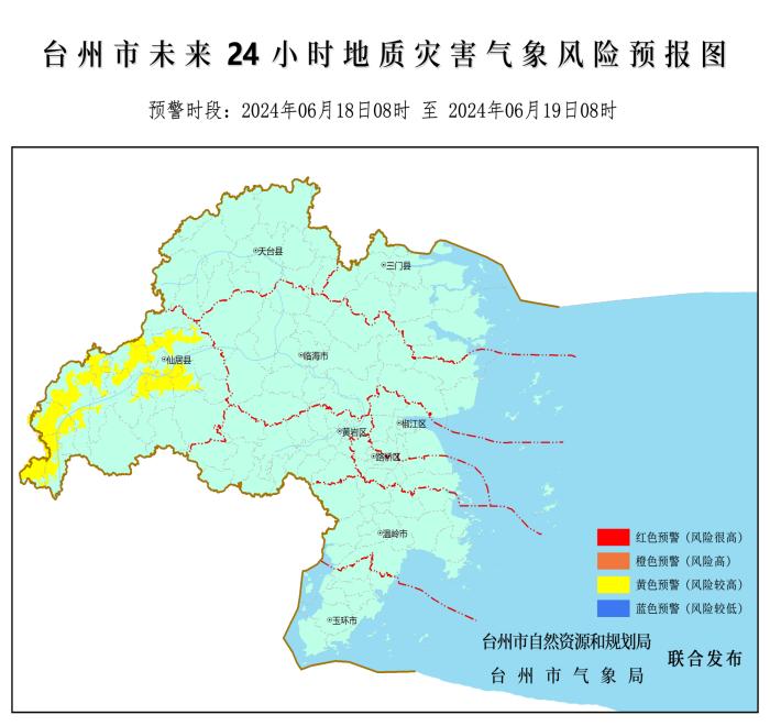 据最新气象资料分析,今天我市阴有阵雨,部分地区雨量中到大,中西部地区局地暴雨;最大小时雨强20~40毫米。预计未来24小时,仙居县部分地区地质灾害气象风险较高(黄色预警)。