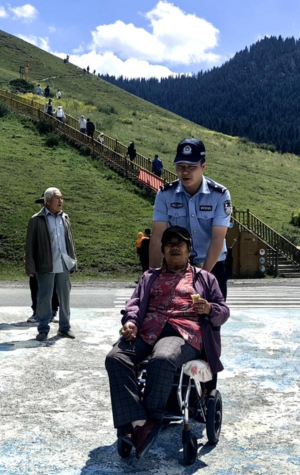 6月17日,乌鲁木齐县公安局板房沟派出所照壁山便民警务站民警为老年游客推轮椅,将其安全护送至观景台。侯檑摄6月17日,凌晨时分一场阵雨将乌鲁木齐的天空洗得格外湛蓝,这座城市在灿烂阳光下迎来了古尔邦节。当日,记者来到景区景点,和坚守岗位的公安民警一起执勤,感受浓浓的节日氛围和服务游客的公安温度。