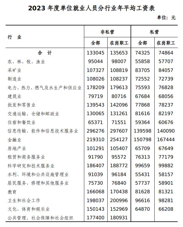 2023年,浙江省非私营单位就业人员年平均工资为133045元,比2022年度增加4220元,增长3.3%,扣除价格因素,实际增长3.0%;私营单位就业人员年平均工资为74325元,比上年增加2391元,增长3.3%,扣除价格因素,实际增长3.0%。