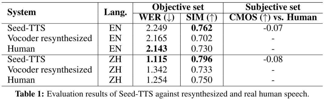 在主观测试中,Seed-TTS 在英语和普通话上的表现与真人语音接近 ——CMOS 分数分别为 -0.07 和 -0.08。