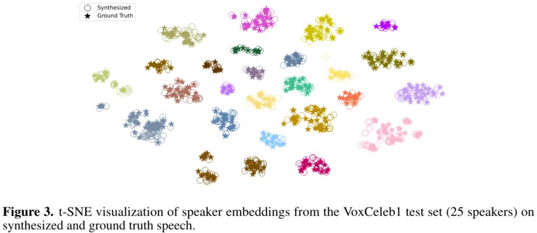 可以看到,相比于真人数据,Seed-TTS 生成的数据在 clean 集上表现很好,在 other 集上表现较差。该团队猜测这是因为 Seed-TTS 在生成过程中倾向于降低背景噪声,从而对噪声的稳健性降低。可视化真人语音与 ICL 语音的说话人相似度。为了验证合成语音中音色的保留情况,该团队使用 t-SNE 绘制了 25 个说话人的真人语音和合成语音的说话人嵌入,结果见图 3。