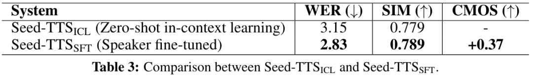 他们使用 WER 和 SIM 客观指标与 CMOS 主观指标评估了微调版 Seed-TTS_SFT 和基础版 Seed-TTS_ICL 生成语音的表现。实验结果见表 3。
