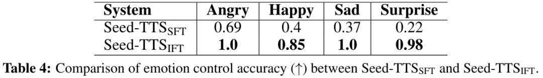 结果见表 4。该团队发现,即使没有明确的控制信号,Seed-TTS_SFT 依然在情绪控制方面得到中等准确度。