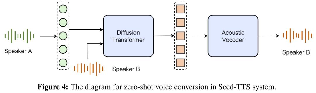 该团队在音色属性方面做了实验。他们注意到,通过在 Seed-TTS 生成期间向扩散模块引入说话人扰动,就能合成内容与韵律模式相同但音色不一样的语音。如图 4 所示,这一任务也被称为零样本语音转换(zero-shot voice conversion)。