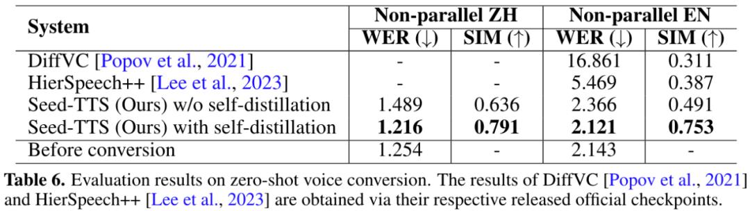 通过使用原始语音以及修改过音色的语音组成的增强型合成数据对,该团队对 Seed-TTS 系统的扩散模型进行了重新训练。实验结果见表 6。