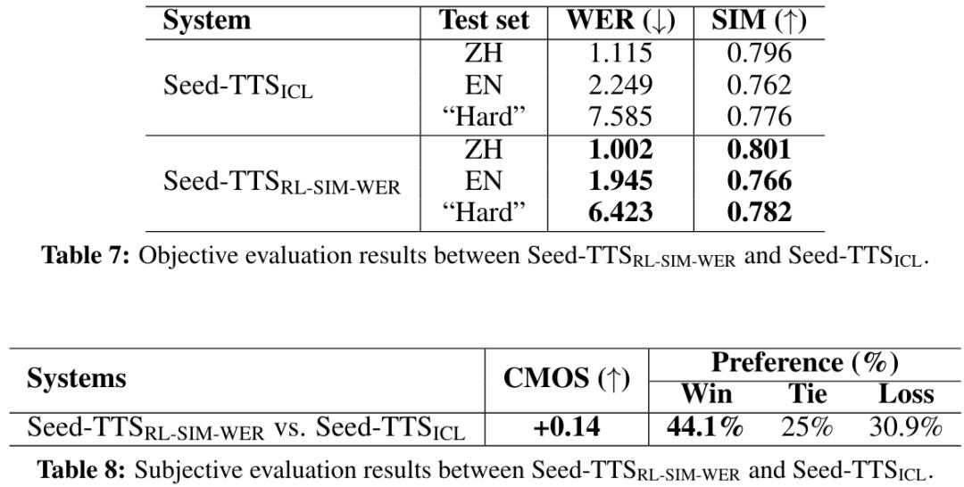 该团队也探索了使用强化学习方法来提升 Seed-TTS。他们比较了使用外部奖励模型的强化学习方法(如 PPO 和 REINFORCE)以及不使用外部奖励模型的方法(如 DPO)。