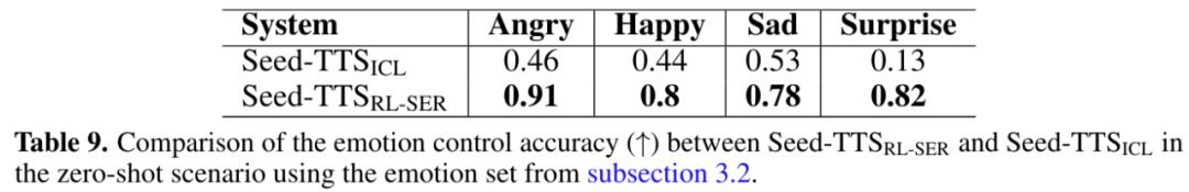 从表 9 则可以看到,相比于上面的说话人微调式 Seed-TTS_SFT 模型,Seed-TTS_{RL-SER} 的情绪可控性下降了,但相比于 Seed-TTS_ICL,使用强化学习能大幅提升在各种情绪上的情感控制准确度。下面是一组示例:prompt:
