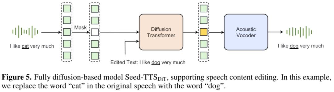 相比于采样下一 token 语言建模的方法,这种纯粹的扩散模型的工作流程更简单。Seed-TTS_DiT 是一种非流式模型,很自然支持内容编辑应用,如图 5 所示。话虽如此,语言建模方法也有自己的优势:流式处理以及能够整合基于文本的语言模型。