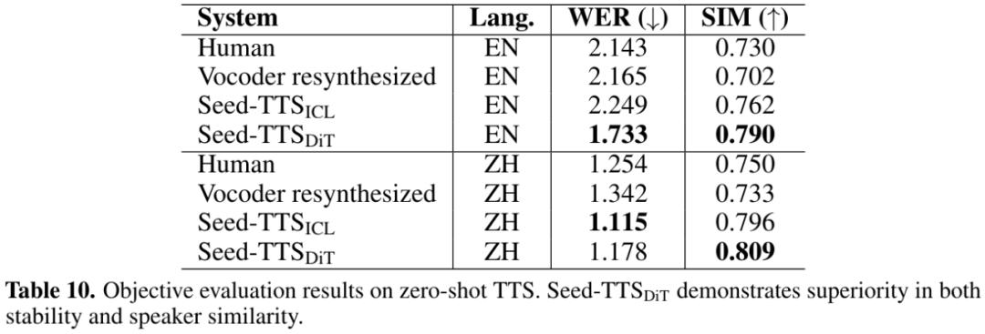 该团队使用之前的测试集评估了 Seed-TTS_DiT 的零样本 TTS 能力,评估结果见表 10。
