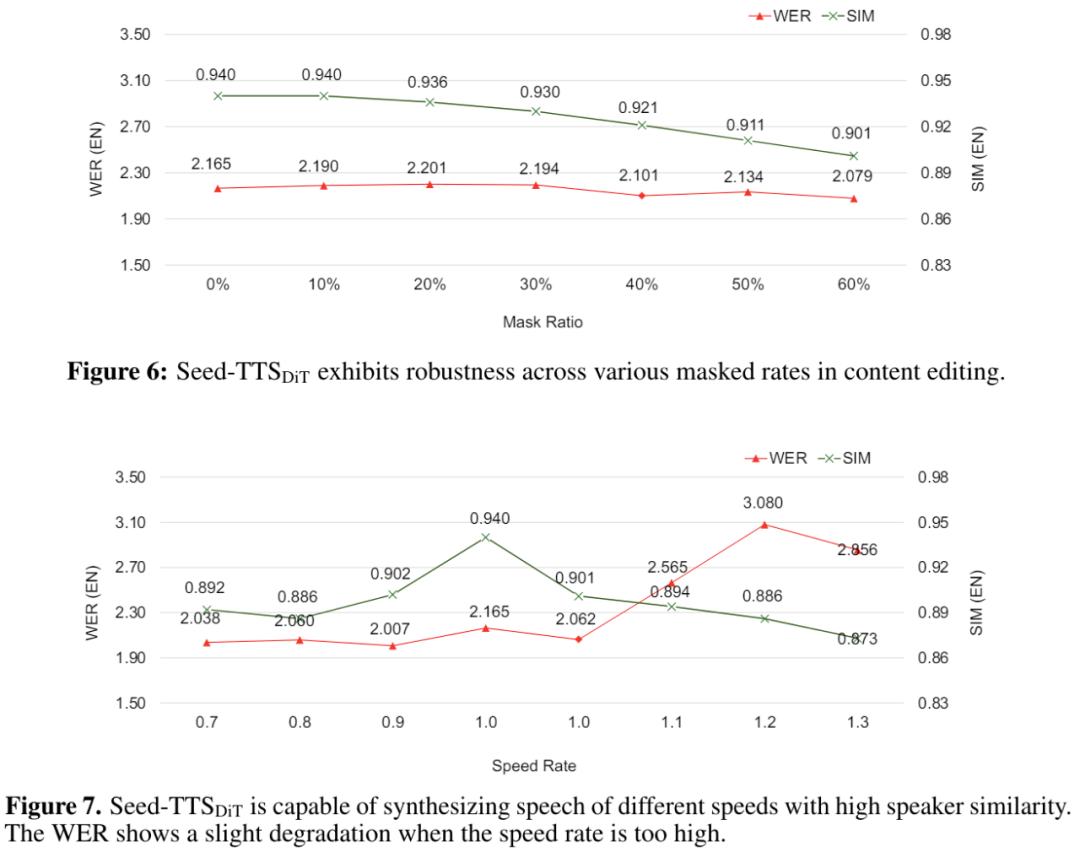 可以明显看出,在内容编辑时,Seed-TTS_DiT 在不同的掩蔽率下表现很稳健。而 Seed-TTS_DiT 也确实能在不同语速下合成高说话人相似度的语音,但当语速过快时,WER 指标会变差一些。最后展示一个内容编辑的示例: