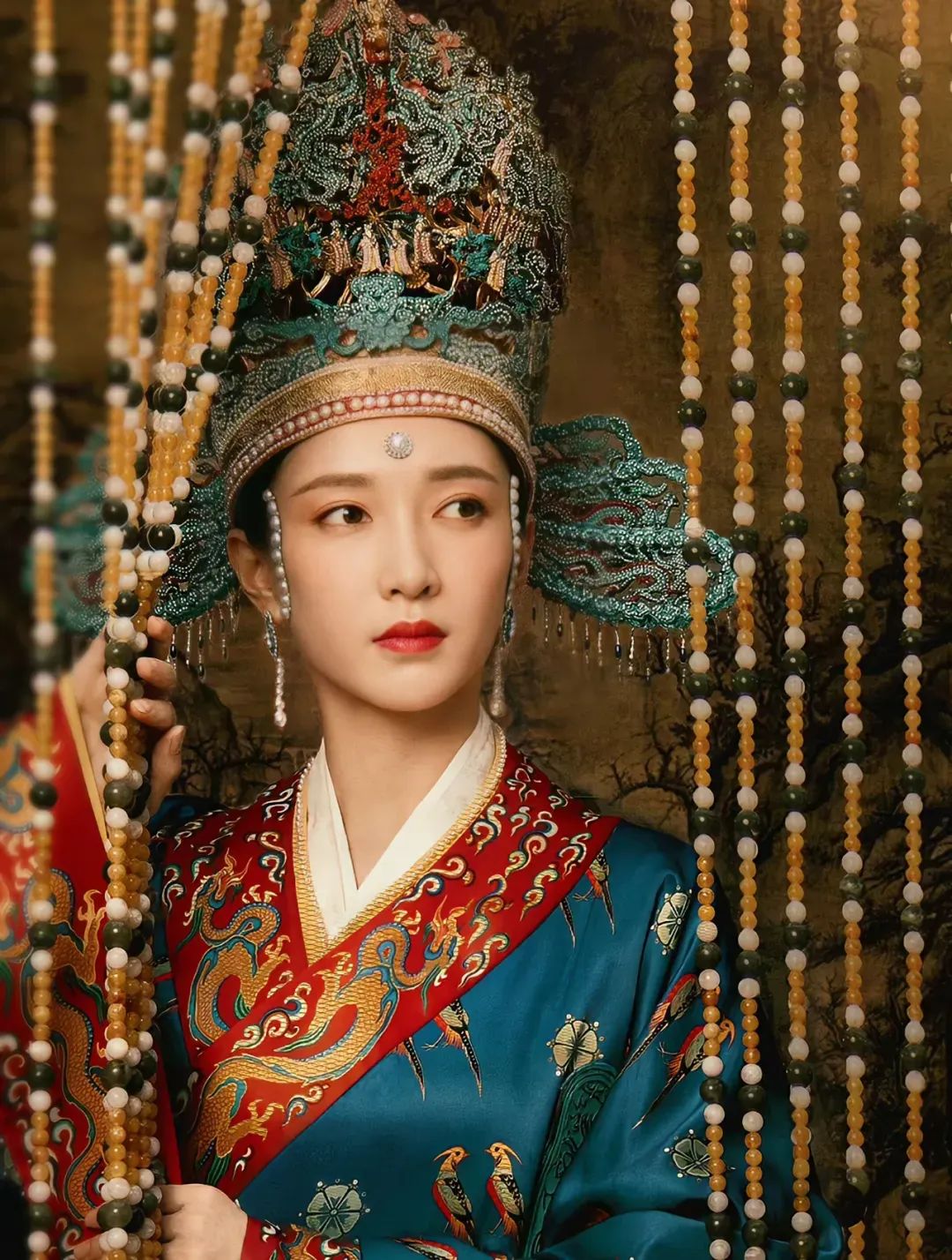选用的珍珠浑圆饱满,体现了皇家的贵气,而且将珍珠巧妙的融入到角色的整体造型中,体现了角色的身份地位。